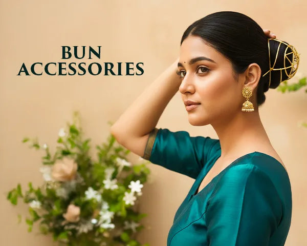 Our hair bun accessories collection offers multiple products that match every party theme or vibe. Whether you are attracted by decorative hair bun pins, floral bun clips, gold-plated juda pins, kundan-studded bun chains, or hair bun scrunchies. There are endless styles in this collection, all of which are curated to match every personality, irrespective of the occasion.