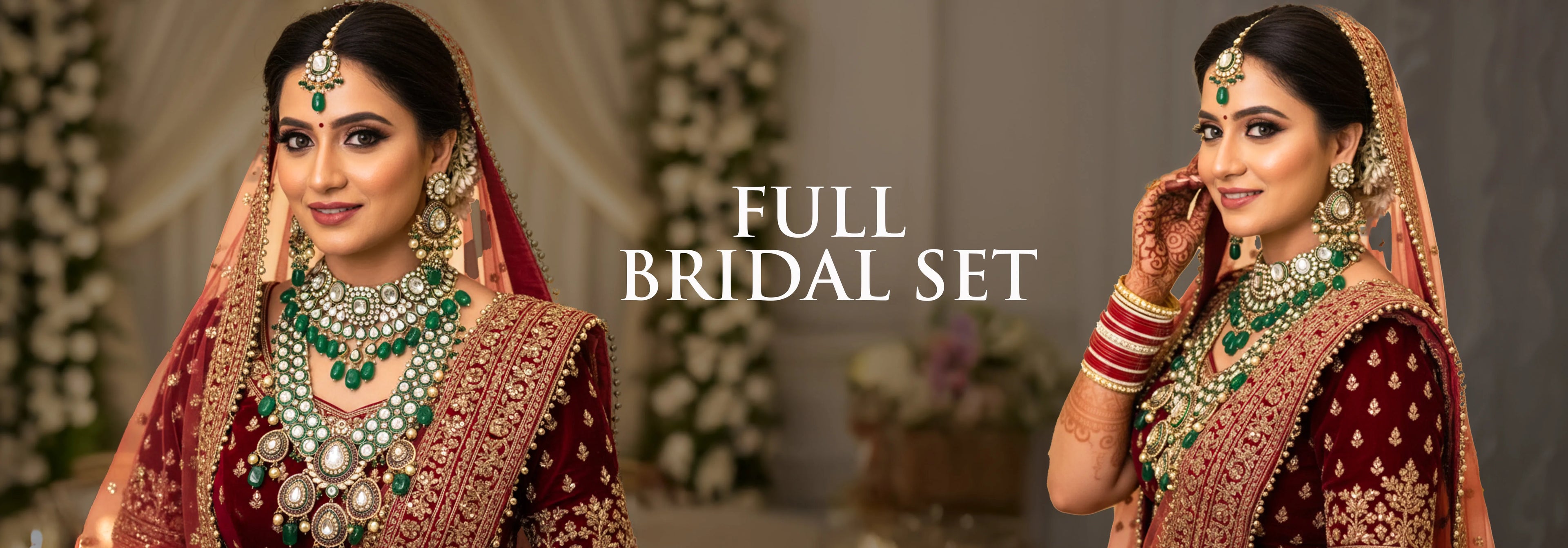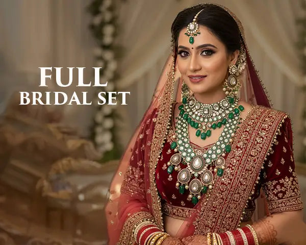 Some of the popular choices in semi-precious full bridal jewellery that will instantly capture wonderful memories include Zirconia Diamond Full Bridal Maroon Set, Emerald Jadau Full Bridal Set, and Polki Full Bridal Set With Headgear.