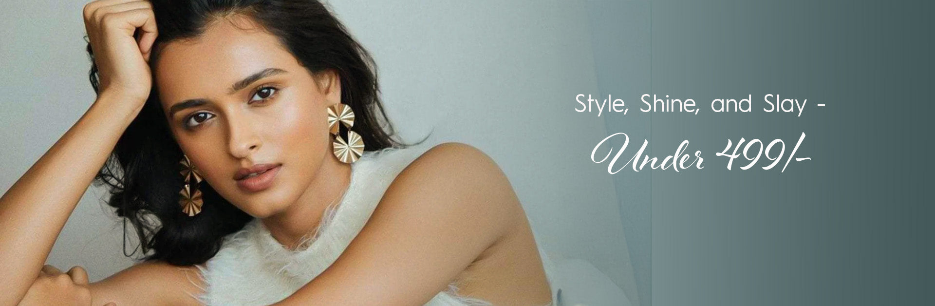 For example, Chandbali Earrings under 499, classic Stud Earrings under 499, trendy Hoop Earrings under 499, delicate Ear Cuff Earrings under 499, and vibrant Dangle Earrings under 499. Each woman's jewellery promises to elevate your style without breaking the bank. Pair it with both your ethnic and western wear and add a touch of charm wherever you go.