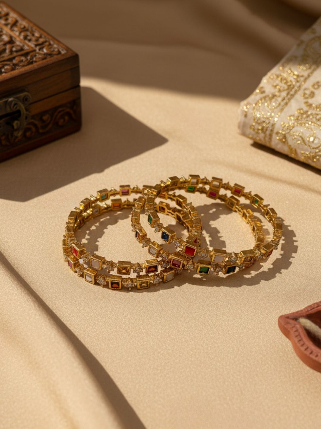 Matte Finish Navarathna Block Stone Set Of 4 Bangles